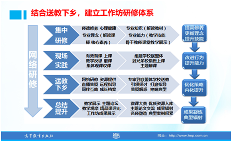 3. 結(jié)合送教下鄉(xiāng),建立工作坊研修體系--網(wǎng)絡(luò)研修、集中研修、現(xiàn)場實踐和送教下鄉(xiāng)相結(jié)合。