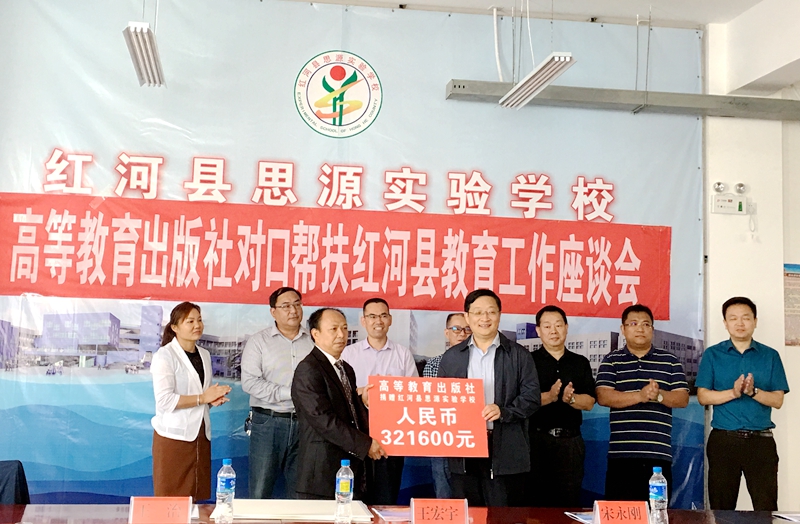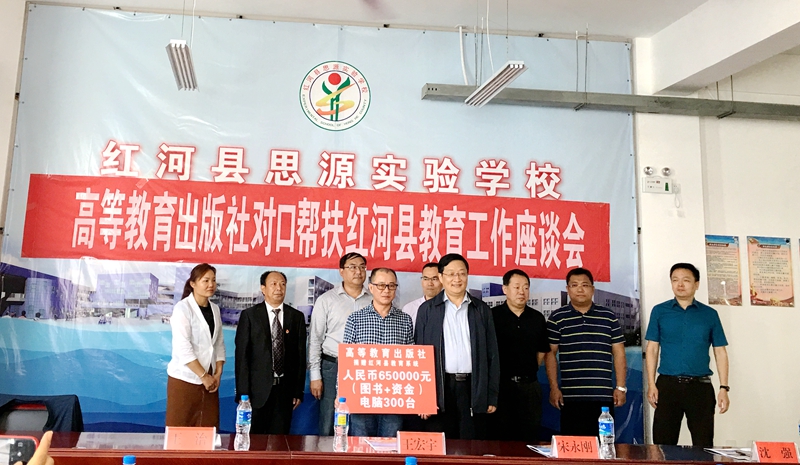 在紅河調研期間,還舉行了捐贈儀式。高教社向紅河縣捐贈總計65萬元的資金和圖書、以及300臺電腦,用于改善紅河縣基礎教育設備設施;向思源實驗學校捐贈32萬余元,用于購買課桌椅、雙層床架和教學設備;代表高教社員工向紅河縣紅十字會捐贈10.4萬元,作為120名貧困學生助學款。高教社全體員工,用一片愛心,一份熱誠,助力紅河脫貧攻堅任務,一起迎接美好的明天。