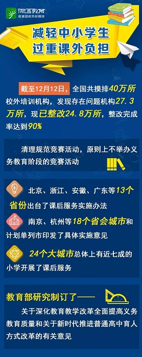 為推進綜合治理,教育部正會同有關部門研究制定中小學生綜合減負措施,明確各方責任,形成政府、學校、校外培訓機構、家庭協同推進減負工作合力。呂玉剛表示,下一步,要進一步加大校外培訓機構治理力度,切實解決校外培訓機構存在安全隱患、無證無照、超標超前教學等突出問題,確保年底前完成集中整改工作。在此基礎上,強化督導檢查,鞏固治理成果,堅決防止反彈,建立健全校外培訓機構規范有序發展的長效機制,使校外培訓走上制度化、規范化管理軌道,真正成為學校教育的有益補充,促進中小學生全面健康發展。