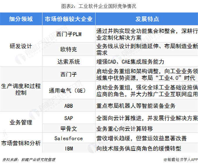 在設(shè)計軟件、實驗驗證軟件、生產(chǎn)流程信息化管理系統(tǒng)等相對終端較高軟件技術(shù)領(lǐng)域,西門子、博世、IBM、SAP、甲骨文、羅克韋爾等跨國公司已經(jīng)占據(jù)市場主導(dǎo)地位;國產(chǎn)工業(yè)軟件多為標準化通用型產(chǎn)品,對產(chǎn)品定制和二次開發(fā)積累不足,導(dǎo)致難以滿足特定場景的需求。