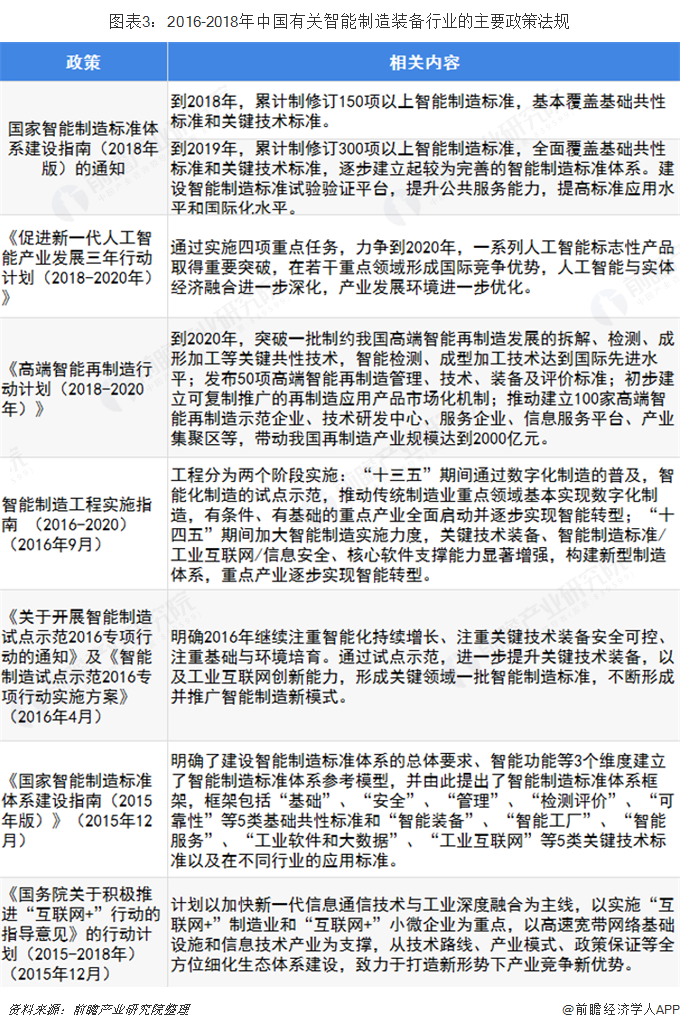 為改變國外企業(yè)在高級智能制造裝備上獨大的局勢,為增強和推動本國智能制造產(chǎn)業(yè),國家相繼出臺多條行業(yè)政策助力發(fā)展。例如,2018年8月,工業(yè)和信息化部、國家標準化管理委員會共同組織制定了《國家智能制造標準體系建設(shè)指南(2018年版)的通知》,通知中明確指出到2019年,累計制修訂300項以上智能制造標準,全面覆蓋基礎(chǔ)共性標準和關(guān)鍵技術(shù)標準,逐步建立起較為完善的智能制造標準體系。建設(shè)智能制造標準試驗驗證平臺,提升公共服務(wù)能力,提高標準應(yīng)用水平和國際化水平。