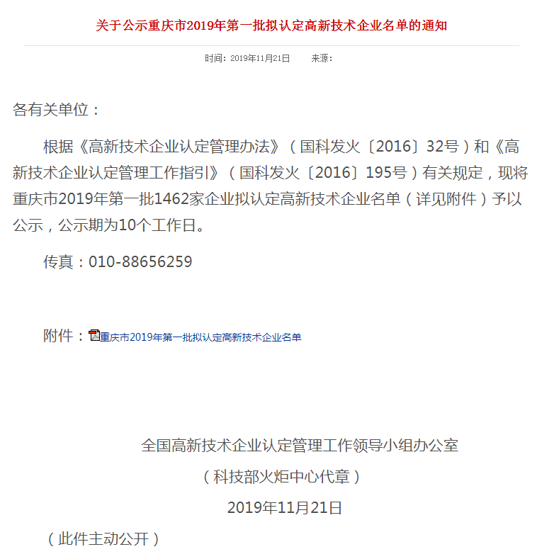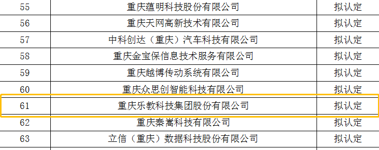 全國高新技術企業認定管理中心根據《高新技術企業認定管理辦法》(國科發火〔2016〕32號)和《高新技術企業認定管理工作指引》(國科發火〔2016〕195號)有關規定,公示了重慶市2019年第一批1462家企業擬認定高新技術企業名單,重慶樂教科技集團股份有限公司入選。