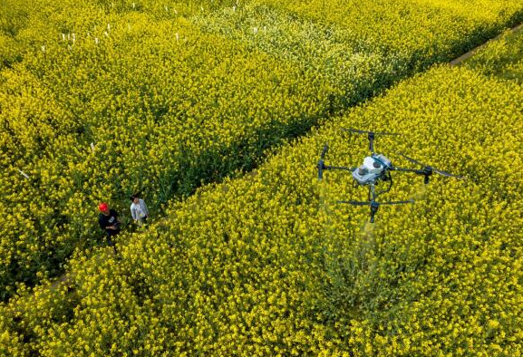 重慶南川區的油菜田上空一架無人機在駕駛員的操控下,忙碌地進行著飛防作業。無人機騰空而起,在油菜田上空按照預定路線勻速飛行,精準進行飛防作業。